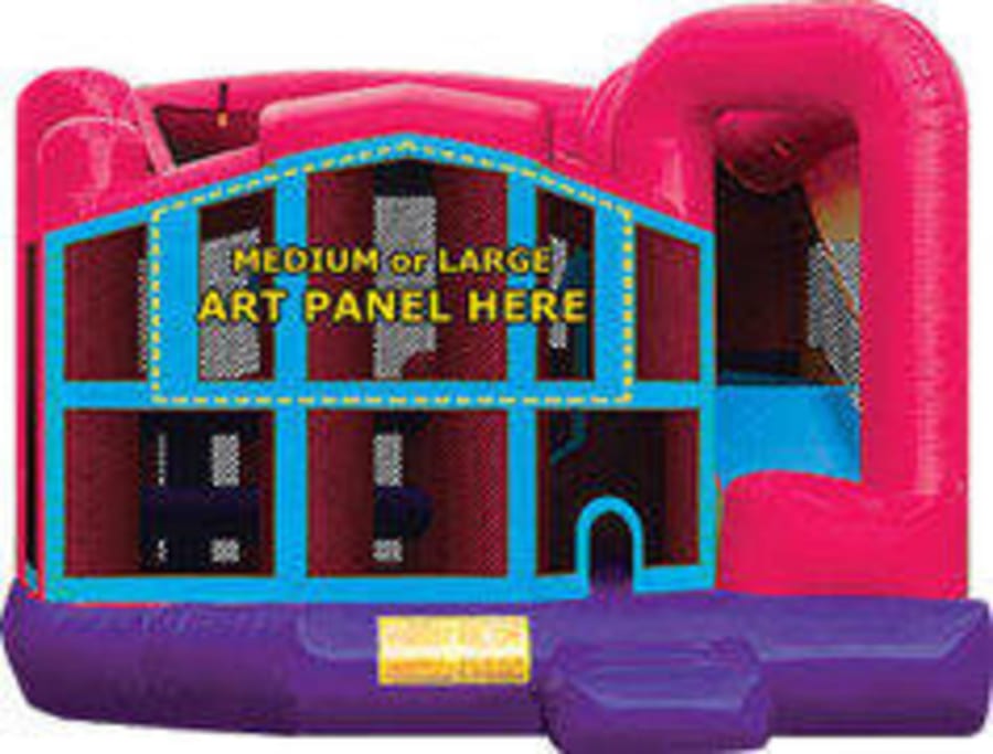 The 5-in-1 combo style bounce house is the ultimate in inflatable jumpers! The large interior jumping area offers a basketball hoop and both log and pop-up obstacles. This bouncy castle has a climb feature and a convenient exit slide for hours of active fun! Parents and spectators are offered a clear view with the 360-degree mesh sides of this moonwalk. The 5-in-1 combo bounce house is made of lite n strong™ fire-resistant vinyl for safety, durability and easy portability. This 5-in-1 bouncy house is sure to make any indoor or outdoor event a great success!