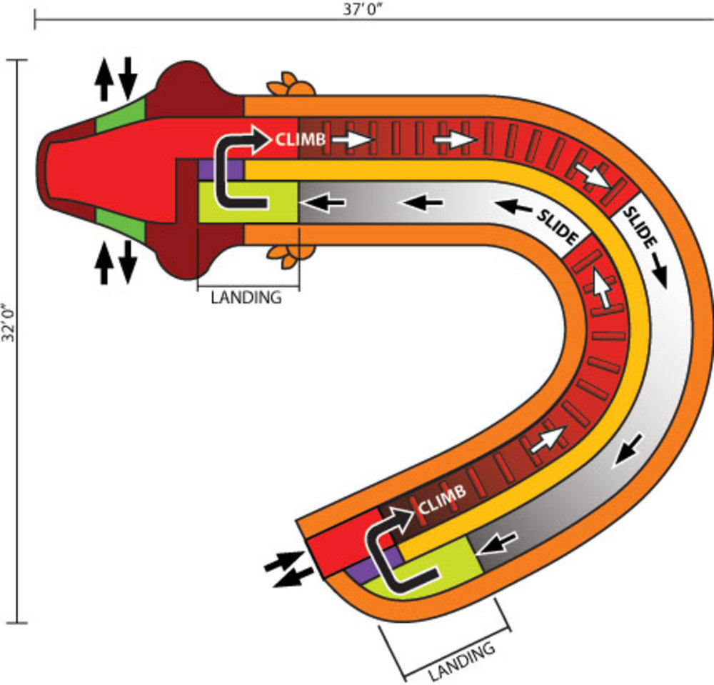Get ready to experience the grand age of reptiles with Slideasaurusâ¢, the newest dynamically graphic slide from Ninja Jump. The dinosaur slide's realistic scales, claws and mouth are as impressive as his 85-foot body length! Visitors embark on their Jurassic experience through the jaws of the dino slide and climb up 17 feet to the top of sliding platform and cruise down the curving back of the Slideasaurusâ¢. The 180-degree slide allows the journey to continue; participants can then climb back up the curving dino tail and enjoy a straight slide down through the Dinosaur's mouth. This provides a 190 feet of continuous climb and slide thrill on a single full run.Â