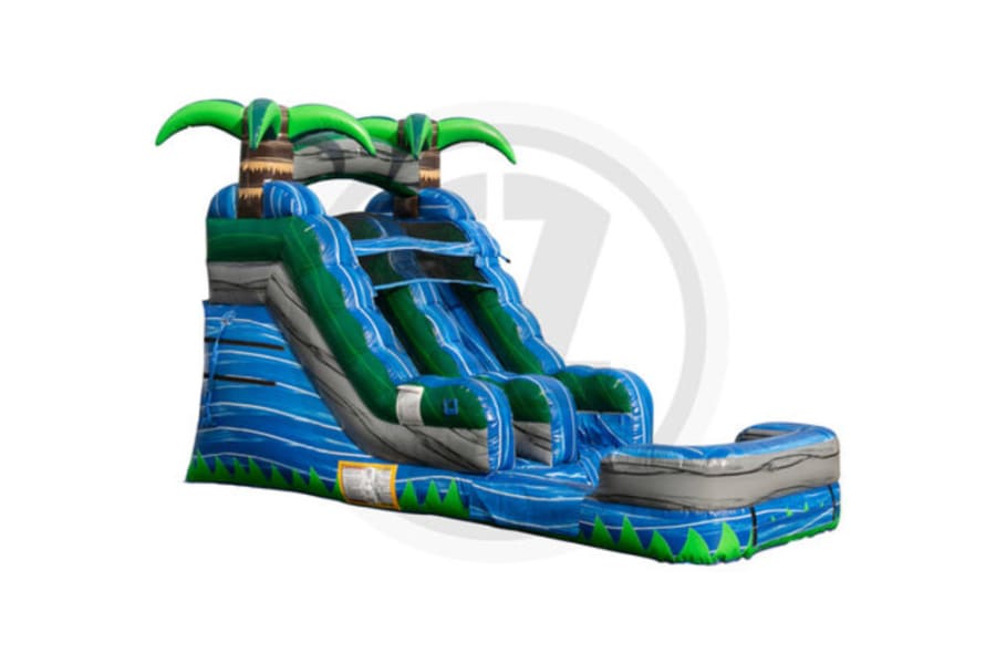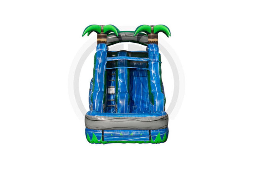 Brand New waterslide is 20ft long, 9ft wide and 12ft high. You will need a space approximately 24ft by 11ft. The splash pool has 4-6 inches of water, with an air cushion bumper for added safety and security.