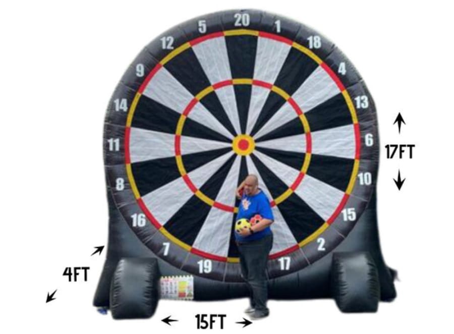 The Soccer Dart features a giant inflatable dartboard with various scoring zones, just like a traditional dartboard. However, instead of throwing darts, players kick a soccer ball at the target, aiming to hit the highest-scoring areas and rack up points.