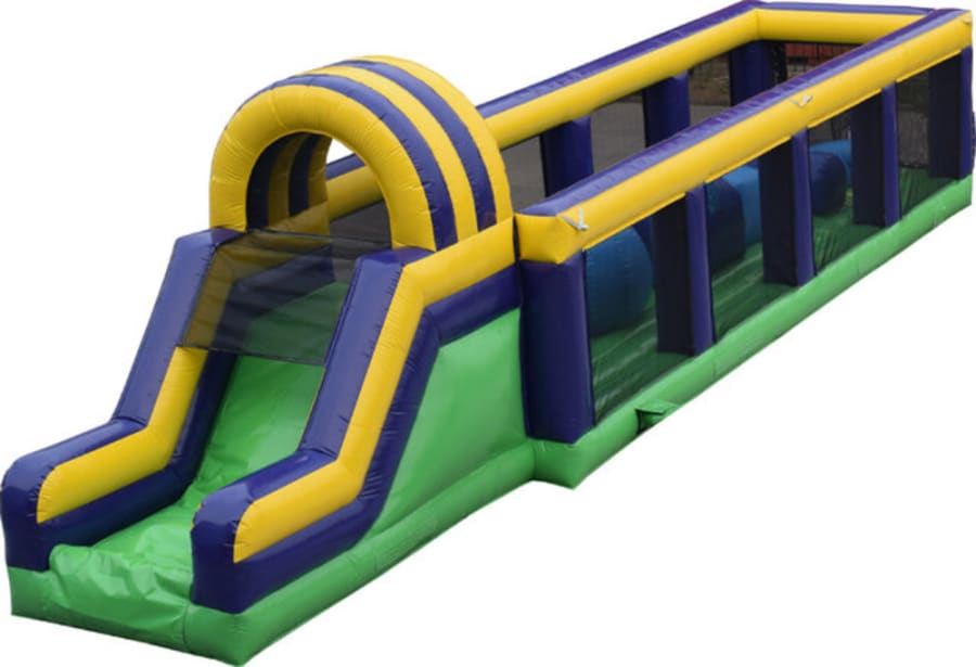 This Warriors Jump interactive obstacle has a series of 7 inflated "pillows" inside that the participant runs / jumps across to reach the end slide platform and slide to exit.
